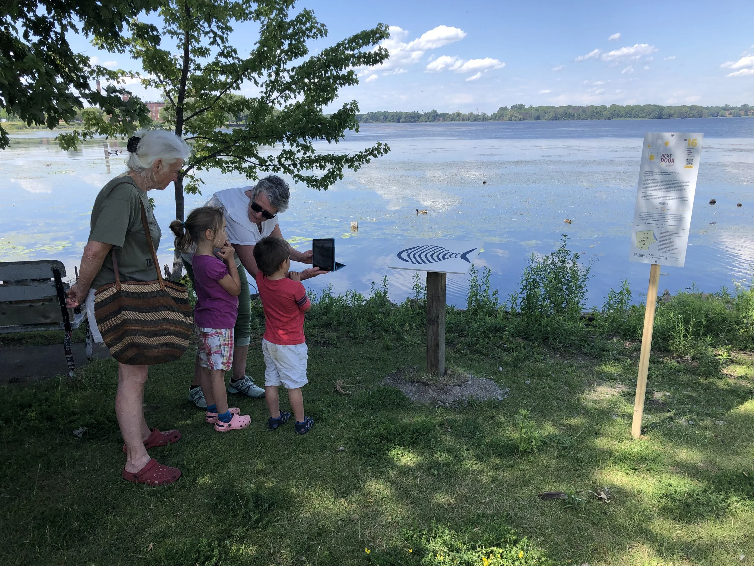 At the southern edge of Doug Fluhrer Park, where the shore curves out into the Cataraqui River, stands a wooden sign with a fish image stencilled on it. The sign activates our Swimming Upstream AR app, an augmented reality artwork that animates hyper-real images of fish that used to be plentiful in the river. When you aim a phone or a tablet at the sign, you can see the fish swimming happily over the water and around the sign — magic created by digital artist Jenn Norton with 3D fish models available online, some of them generated by the Museum of Comparative Zoology at Harvard.