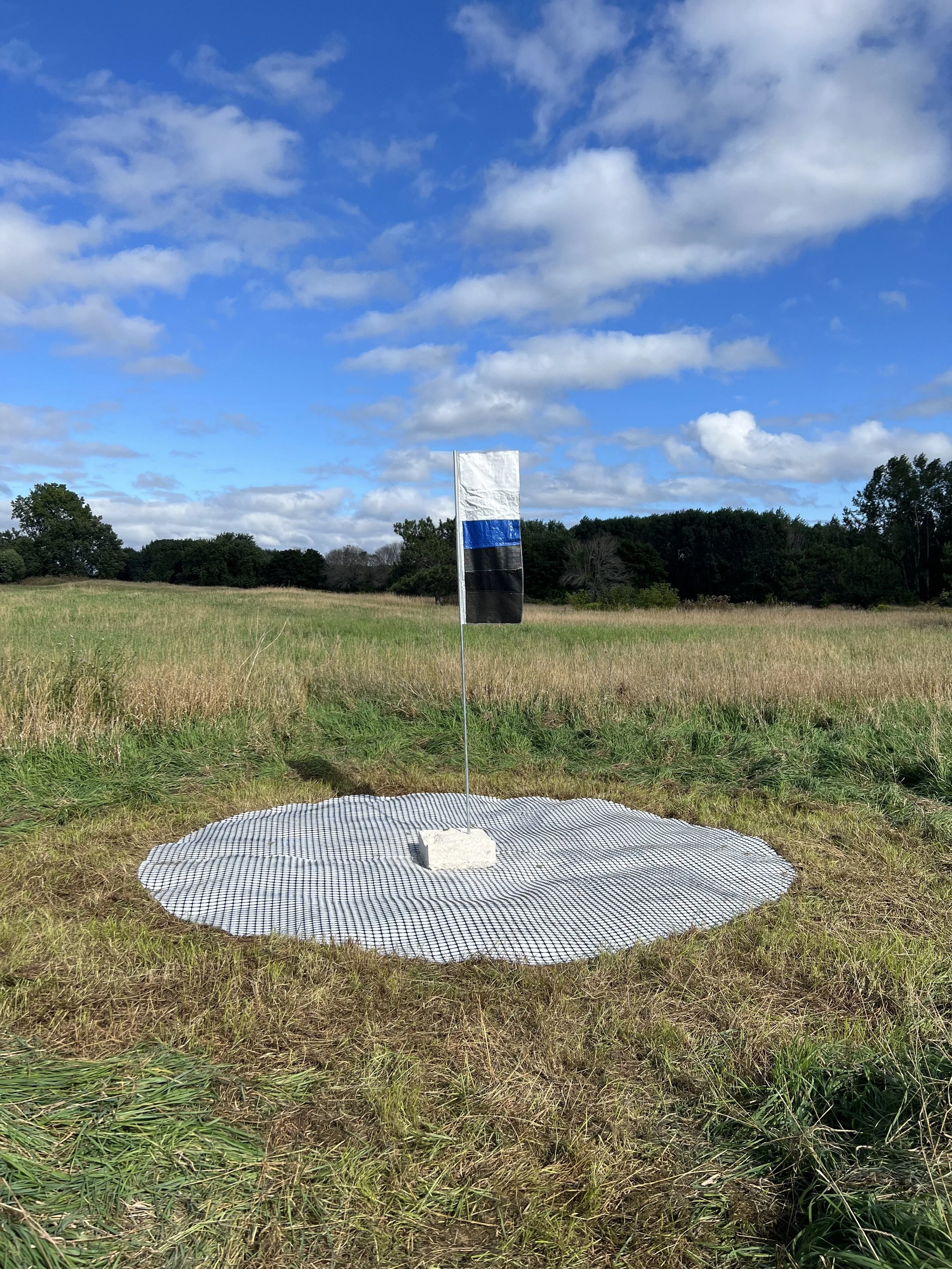 LAWNCARE is a series of site-responsive sculptures that take as their starting point the forms of attention that shape landscapes according to specific desires and protocols. The “lawn” is not found in nature, but actively produced through the complex interplay of culture, ecology, and politics, and the type of care it receives reflects the societal values of a given time and place. Drawing on Belle Park’s former use as both municipal landfill and public 9-hole golf course, the project combines groundskeeping techniques such as mowing with repurposed industrial geosynthetic fabrics used in environmental engineering, and the experimental visualization of subsurface data with golf’s material language of flags, pins and hazards to define a new choreography of the space which focuses attention on lesser-known and unseen episodes sedimented within the site’s entangled histories of earth and time.